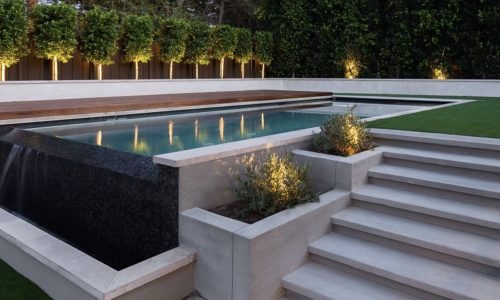 Luxurious Waterfall Edge Porcelain Coping to Waterline Tile.